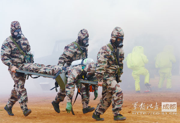 “砰!轰……”随着几声剧烈爆炸,一个化学剂储存罐遭“敌特分子”破坏发生泄漏,大量氯气随风飘散。一支由化学监测、洗消去污等组成的女子应急救援队火速赶往指定地域执行救援任务。