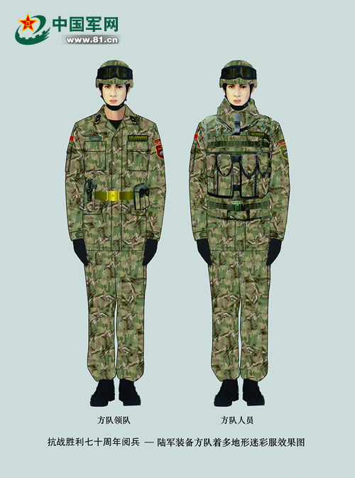 答:2015年6月,多地形迷彩得到了总参、总后首长的大力肯定,指示在研中的这套衣服要在9•3阅兵中提前亮相,着装范围也由原来拟定的一个徒步方队扩展到两个徒步方队及两个装备方队。