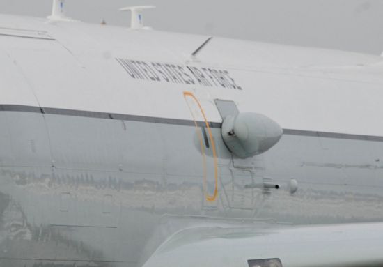 WC-135W装备了能够收集大气中放射性微粒子的特殊过滤器和采样器,非常精密,可以采集到空气中微量的放射性气体和碎屑。图为机身上的专用采样器,也是该飞机的外观识别特征之一。