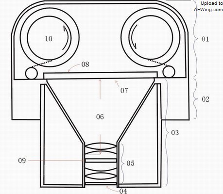 航摄仪的主体部分示意图:01暗盒、02外壳、03镜筒、04滤光片、05透镜组、06镜头焦距、07焦平面、08压平板、09快门和光圈、10胶片传动轴。