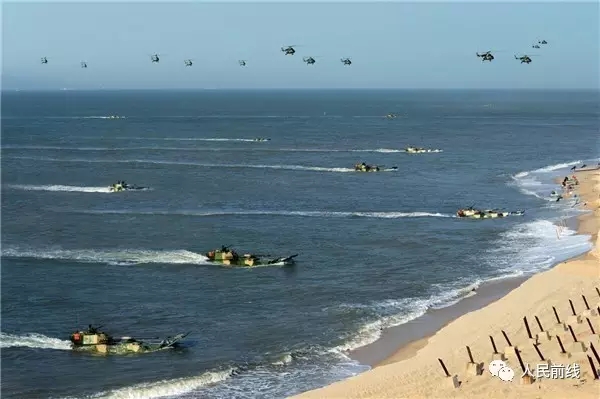 ▲演习中,某旅官兵在陆航部队的配合下向岸滩发起冲击。