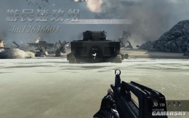 从船上下来后迅速跑到掩体后面躲避,等敌军停止射击的空隙跑到另一个掩体,然后迅速冲向坦克的后方,跟随坦克。