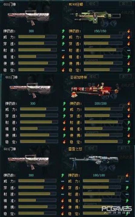 下面是G11门神与其他武器的对比图。可以看出来,G11门神与M249狂蟒子弹一样(150乘2等于300),射速一样,而门神在威力、穿透、便携上都领先,狂蟒的精准、稳定高于门神。与圣诞加特林相比,门神在威力、穿透、便携上胜出,圣诞加特林子弹、射速、精准、稳定上胜出,个人感觉两把枪差不多。最后,雷霆之怒完虐G11门神!
