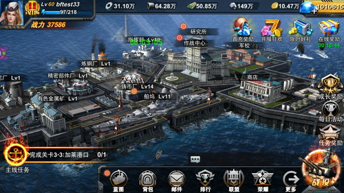游戏的主界面我们可以看到我们的基地是在海上,这里有提供各种建造战舰需要的原材料工厂,也有培养军官的军校,指挥前线作战的指挥部,研究军火科技的研究所,仿佛置身一处真实的军事基地。