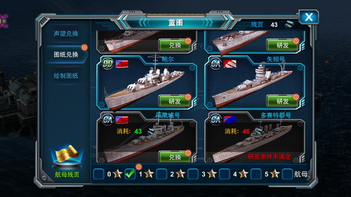 既然是海上的游戏,自然战舰是不可缺少的主力武器了,通过在蓝图这里绘制战舰,用图纸就可以兑换各种级别的战舰,我还只能在1星战舰中挑选,在随着等级和声望的提高,玩家就可以获得更高级别的图纸兑换高级战舰了。
