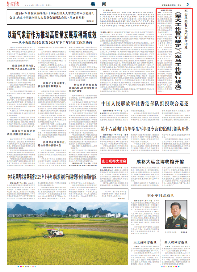 解放军报北京7月24日电 经中央军委批准,中央军委联合参谋部、政治工作部、后勤保障部、装备发展部、训练管理部日前联合印发《军犬工作暂行规定》、《军马工作暂行规定》,均自2023年7月14日起施行。
