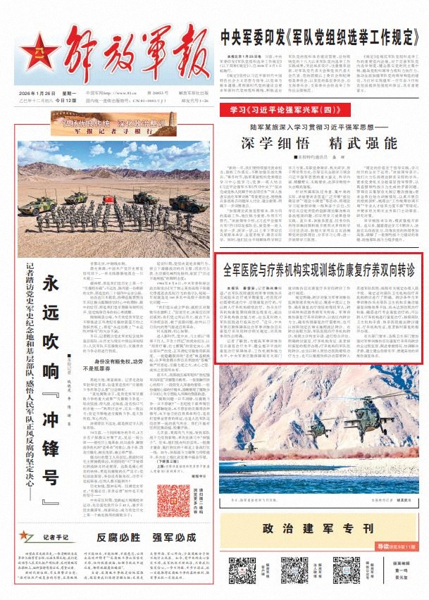 记者了解到,为提高军事训练伤官兵康复治疗水平,健全提升平战时康复治疗保障体系、工作机制和能力水平,中央军委后勤保障部有关部门就训练伤官兵康复疗养双向转诊工作进行规范。