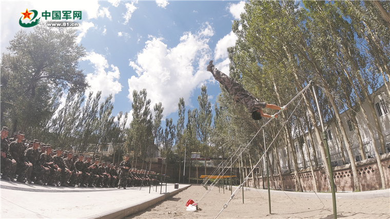 体操教练何云龙为火箭军新训基地官兵做单杠8练习示范。李京鹏摄