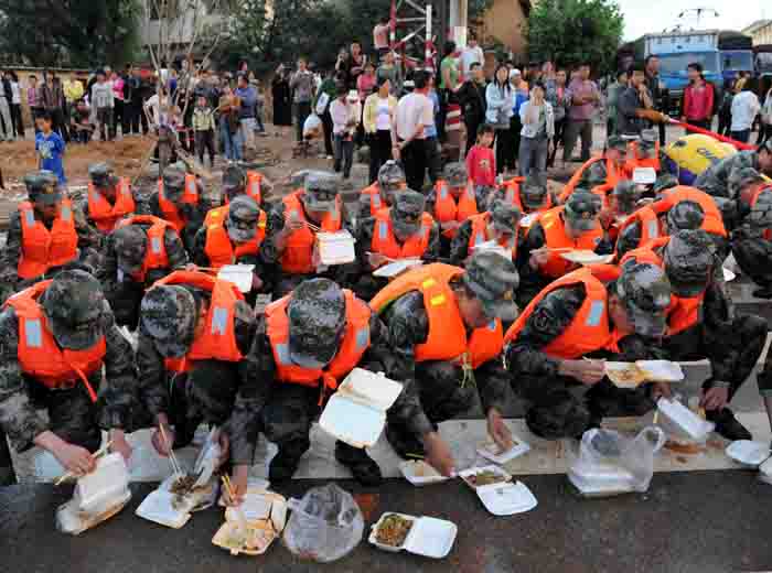假如以“优良作风”为主题,让你创作一幅摄影作品,你该如何构思创作?眼前这幅作品,恰好是这个选题的最好写照,是人民解放军优良作风的生动形象诠释:即使是在十万火急的危难时刻,即使是在紧张的抗洪救灾现场,即使是几分钟的匆匆就餐,官兵们依然保持纪律严明、训练有素的优良作风。可以想见,这种优良作风是千锤百炼形成的,融入了军人的血液里,成为军人无论何时何地集体下意识的自觉行动。看到这样的画面,人民军队、铁的纪律、训练有素、优良作风这些字眼油然而生。换了任何一个别的群体,不可能出现这样“特别的风景”。