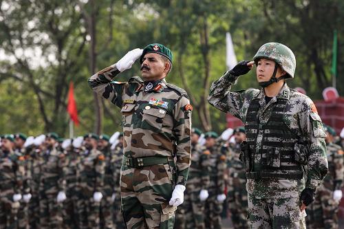 2014年11月17日,在印度浦那的奥恩德军营,中国参训官兵参加“携手—2014”中印陆军反恐联合训练开训仪式。