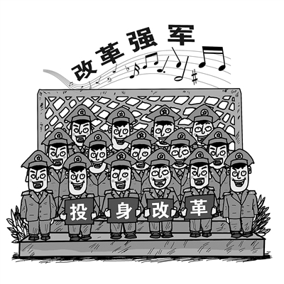 如果把改革比作一首强军进行曲,每个人都努力唱起来,歌声才能激越嘹亮;每个人都在自己的岗位上作出最大努力,尽心尽力干好本职工作,整支歌曲才能协调流畅。