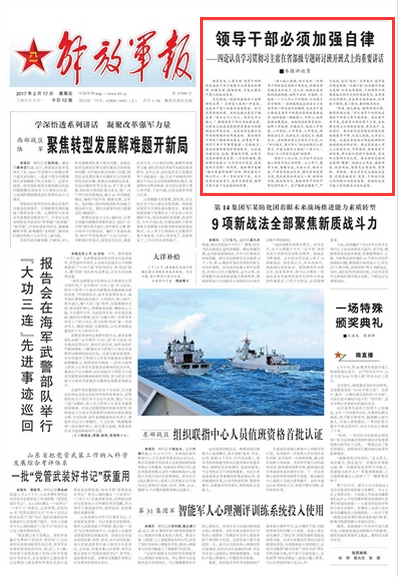 领导干部特别是高级干部只有像习主席要求的那样,加强自律,慎独慎微,才能永葆共产党人的政治本色。今天《解放军报》发表评论员文章《领导干部必须加强自律》,文章指出,强调领导干部必须加强自律,从根本上说是由其执掌重要权力的特殊地位所决定的,也是由其发挥示范作用的特殊职责所要求的。文章强调,军队领导干部特别是高级干部身上有千钧重担,身后有千军万马,是强军兴军的骨干力量,在加强自律上必须标准更高、要求更严、走在前列。要注重自觉同特权思想和特权现象作斗争,从自己做起,从身边人管起,从最近身的地方构筑起预防和抵制特权的防护网。