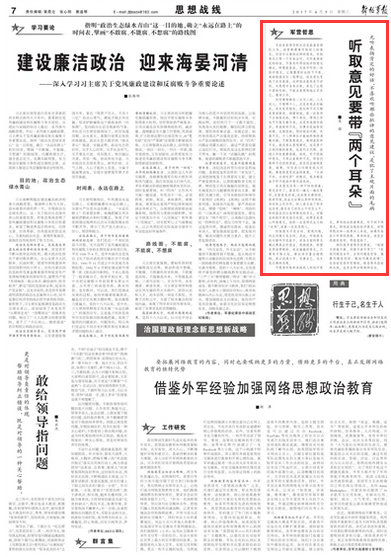 今日《解放军报》刊登文章《听取意见要带“两个耳朵”》指出,听取意见不是目的,发现问题、纠正问题才是目的。即便是那些带刺的、有点偏激的意见,只要有可取之处,都应该尽量合理吸纳,用以改进工作、完善自己。这才是正确的态度。