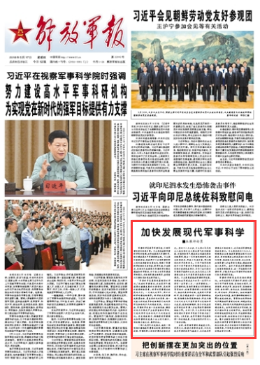 习主席在视察军事科学院时强调,加快发展现代军事科学,努力建设高水平军事科研机构。习主席的重要讲话,深刻揭示了加强军事科研工作的极端重要性紧迫性,明确了军事科学创新的目标任务、科学内涵、方法要求,是新时代发展现代军事科学的根本遵循和科学指南,对于抢占世界军事竞争制高点、开拓强军事业新境界,具有重大引领作用和深远指导意义。请关注今天的解放军报评论员文章——