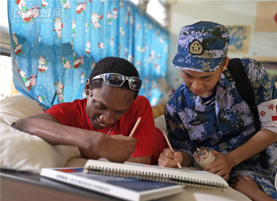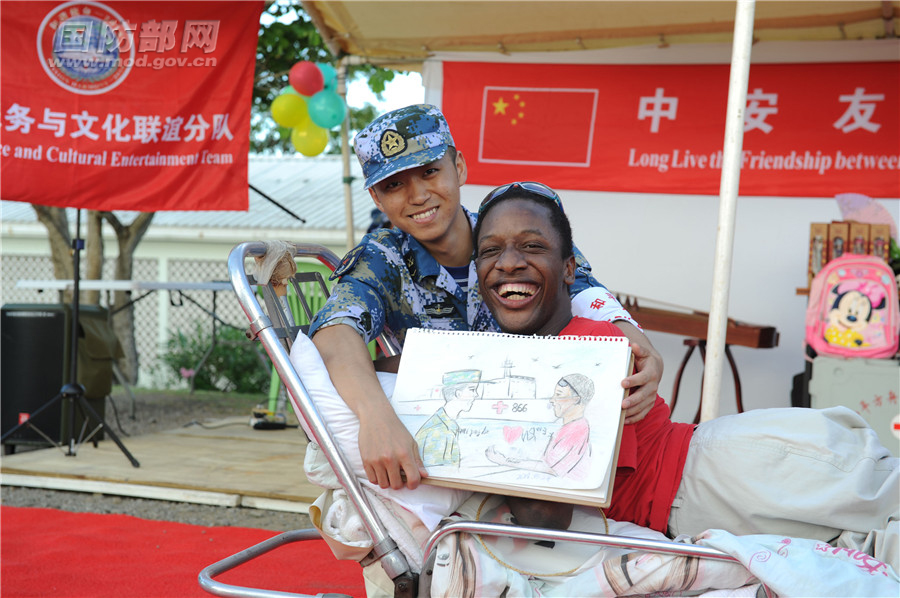 活动当天,擅长绘画的船员桂江波与柯枫共同完成了一幅画作——以和平方舟与和平鸽为主题,相互画出心中的对方,以此祝愿世界和平,并见证彼此的友谊。
