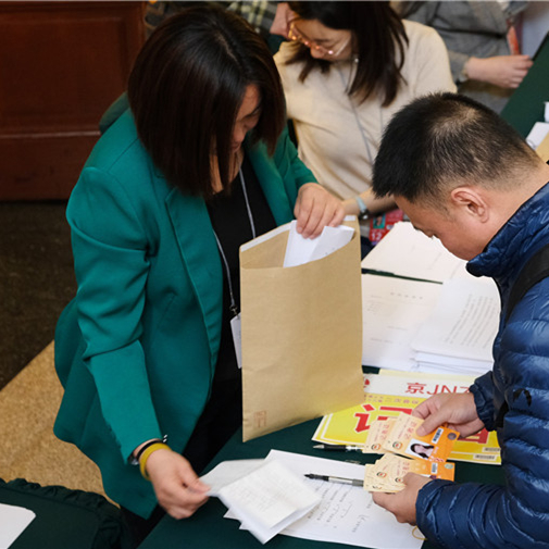 2月27日,全国政协十三届二次会议内地记者情况通报会在全国政协礼堂举行。这是记者领取参会证件。中国军网记者孙智英 摄