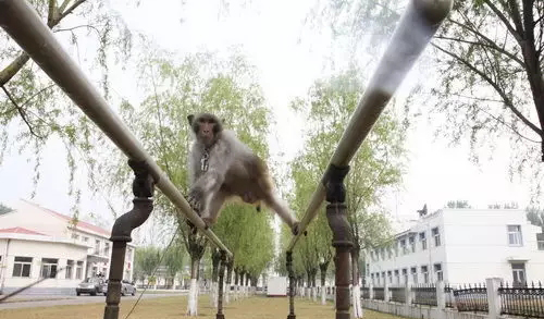 队员们找来木头桩、双杠杆,把绳子缠在上面,再给猕猴下口令。用了不到一周的时间,不管正着缠还是反着缠,猕猴都能顺利“解扣”。