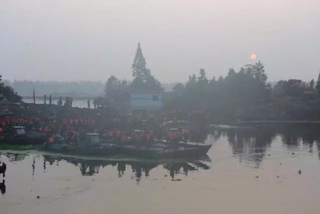 日出东方,在决口的水面上,与官兵身上的救生衣相互辉映。