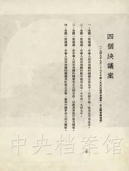1949年9月27日,中国人民政治协商会议第一届全体会议关于国都、纪年、国歌、国旗四个问题的决议草案及决议案。