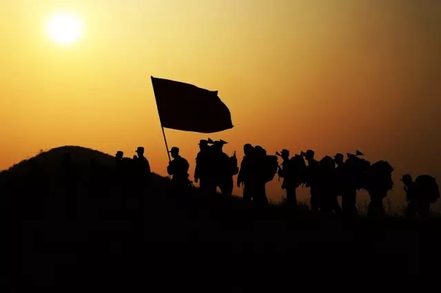 《夕阳·旗帜·兵》:夕阳西下,官兵们高举旗帜,伴着霞光行走在山间。金黄色的霞光、高高飘扬的旗帜、相互搀扶的士兵形成一幅美丽的画卷。