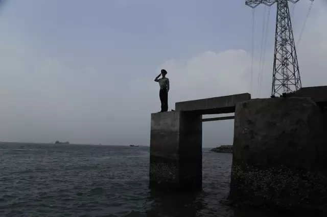 《向祖国(北方)“敬礼”》:图中,战士所在的地方位于珠江口与伶仃洋交汇处面积不足一平方公里的“无居民”海岛,也被驻守在这里的官兵们戏称为“天涯海角边”,身在祖国的南粤大地,战士面朝北方久久的敬了一个军礼,只因为北方是天安门也是战士们向往的地方。