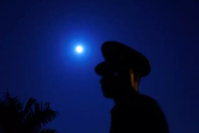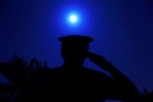 《向“网红月亮”敬礼》:11月14日,美国媒体称当天晚上的满月比上世纪40年代以来的任何一次满月都要大,正在站岗的哨兵得知这个消息,也想与“超级月亮”合影,但又不会摆poss,于是向“超级月亮”敬了一个军礼,留作纪念。