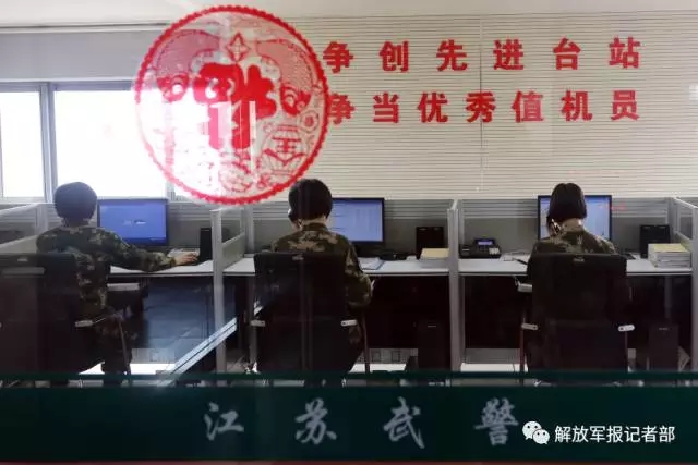 在武警江苏总队通信站话务员值班室外,透过玻璃,看到了正在值班的话务员。