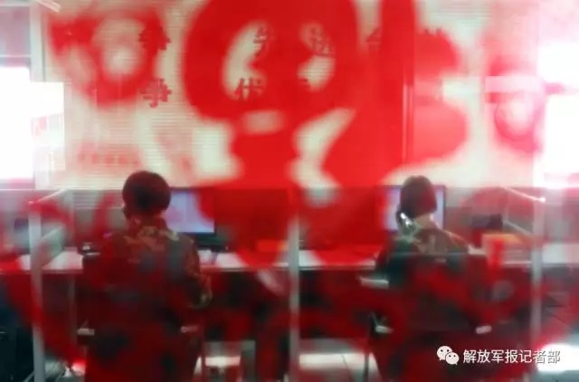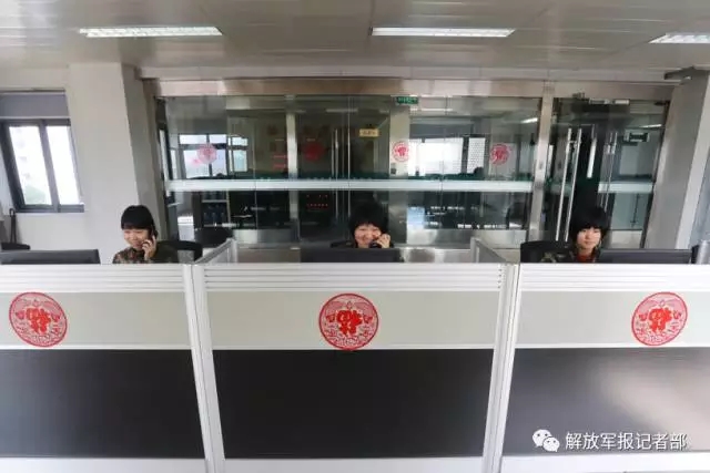 在武警江苏总队通信站话务员值班室外,透过玻璃上贴着的福字,看到了两名正在忙碌的话务员。