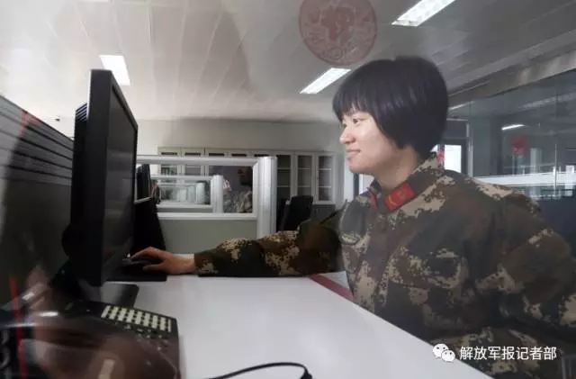 在武警江苏总队通信站话务员值班室内,一名干部正在听班,笑容甜蜜。