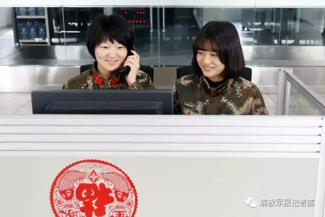 在武警江苏总队通信站话务员值班室内,透过机台的玻璃,看到了福字的影子和话务员灿烂的微笑相互映衬,非常美丽。