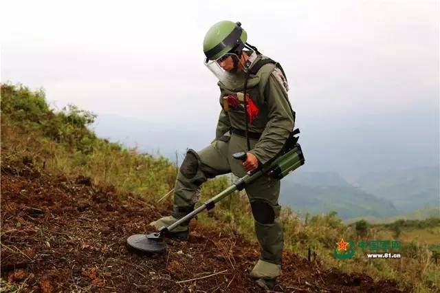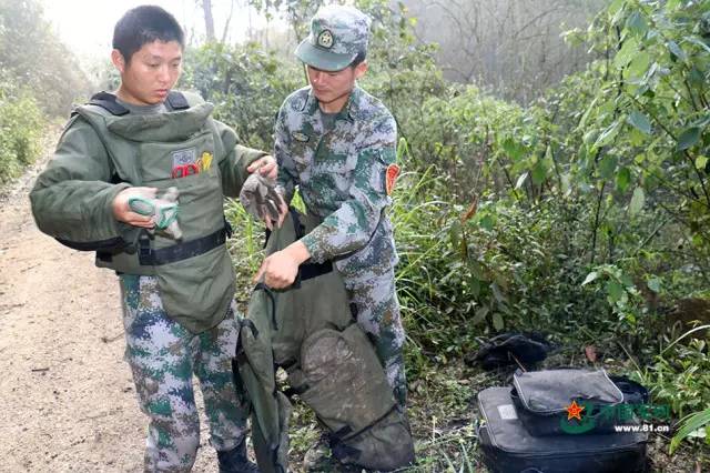 扫雷官兵开始作业前,一定要穿上防护服,防护服一般有几十斤重,需要战友帮助才能穿戴上。