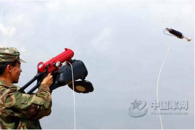 气压抛射扫雷器是将特制的锚钩抛射到雷区进行排雷的一种新型扫雷器材,最适用于排除绊发雷。它利用特制的气瓶喷嘴,将锚钩抛射到雷区,然后作业手再用线拉回射出的锚钩,利用锚钩将雷线勾出,从而达到排雷的目的。其射程为50~90米,具有体积小、重量轻、安全可靠、携带方便等特点。
