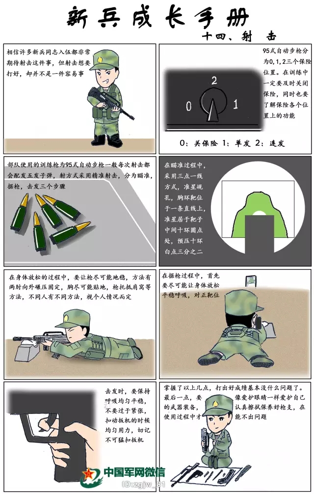 “快看,《新兵成长手册》又更新了!”去年9月,新兵入营后,他创作了一套《新兵成长手册》系列漫画作品。当他创作出的第一幅漫画与新兵“见面”后,立刻受到了大家热烈欢迎,被大家亲切称为“兵心红宝书”。整个漫画分为《内务》《队列训练》《条令条例》《单杠》等14幅,囊括了新兵学习、生活、成长的方方面面。