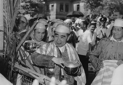 周恩来访问缅甸时,身着缅甸民族服装,手持银碗,同缅甸人民欢庆泼水节。