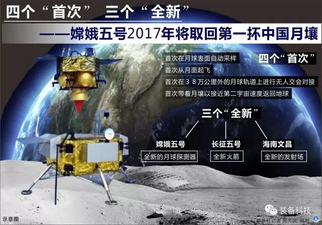 嫦娥五号,在2014年10月24日已成功发射并回收嫦娥五号再入返回试验器的基础上,嫦娥五号,预计于2017年11月底发射,执行在月球表面自动采样并起飞返回的任务。嫦娥五号有望实现中国开展航天活动以来的四个“首次”:首次在月球表面自动采样;首次从月面起飞;首次在38万公里以外的月球轨道上进行无人交会对接;首次带着月壤以接近第二宇宙速度返回地球。