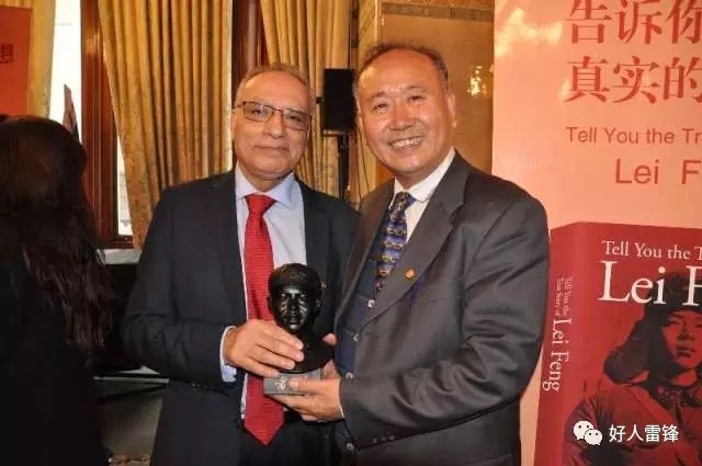 陶克向英国阿拉伯协会主席、瓦菲克穆斯塔法博士赠送中国抚顺雷锋城艺术家用煤晶石雕刻的雷锋塑像。