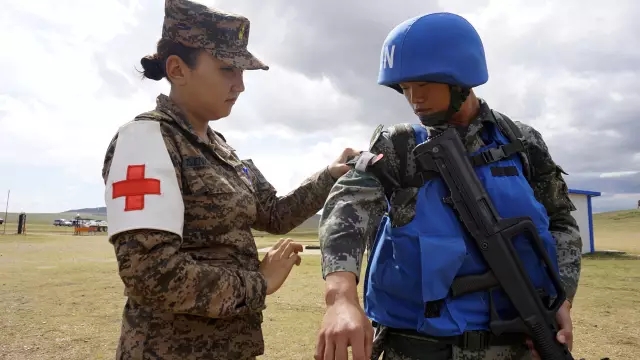 战场救护是“可汗探索-2017”多国维和军事演习的最后一个课目。轮到中国军队上场时,一场瓢泼大雨不期而至。“我看这雨是停不下来了。”考虑到之前已有个别国家因为天气、行程等原因,放弃了这个课目,一名蒙古国的教员走到中国军队面前说:“你们可以选择带回,也可以选择继续演练。”