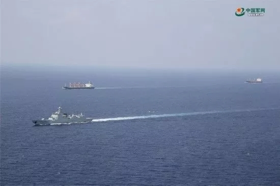 据中国海军网最新消息显示,当地时间9月18日上午,亚丁湾索马里某海域,第27批护航编队海口舰与2艘船舶“腾达”号、“宝宁岭”号组成单纵队向东航行,实施伴随护航。