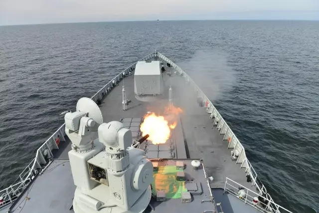 ▲当地时间7月25日,参加中俄“海上联合-2017”军事演习的两国海军舰艇编队分成两个战术群,在波罗的海某海域,进行首个演练科目副炮射击。图为中方合肥舰率先开火。李蕾 摄