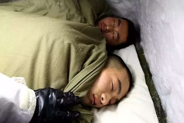 夜里11点,-30°C的雪屋中,冬训的战士们依偎在一起睡觉。天气极度寒冷,甚至蹬个被子都会造成冻伤。