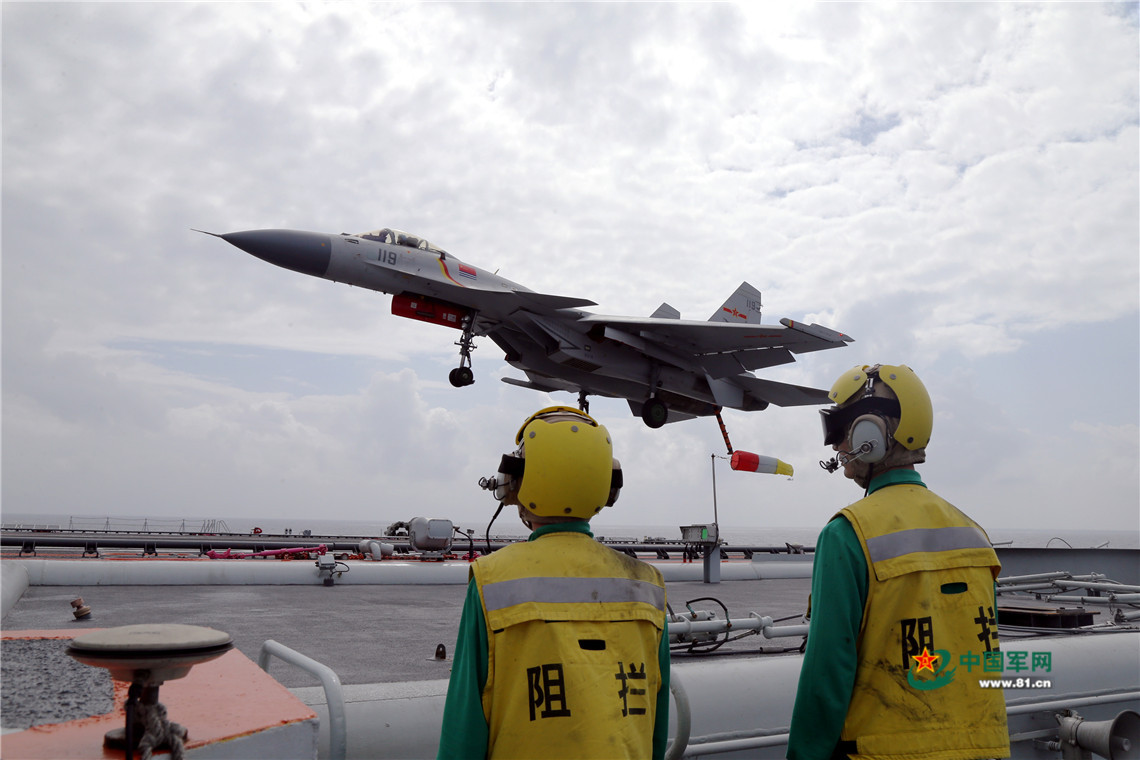 歼-15舰载战斗机放下尾钩准备着舰。莫小亮 摄影
