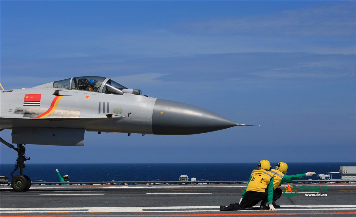 2017年7月1日,一架歼-15舰载战斗机在辽宁舰飞行甲板降落。曾涛 摄影