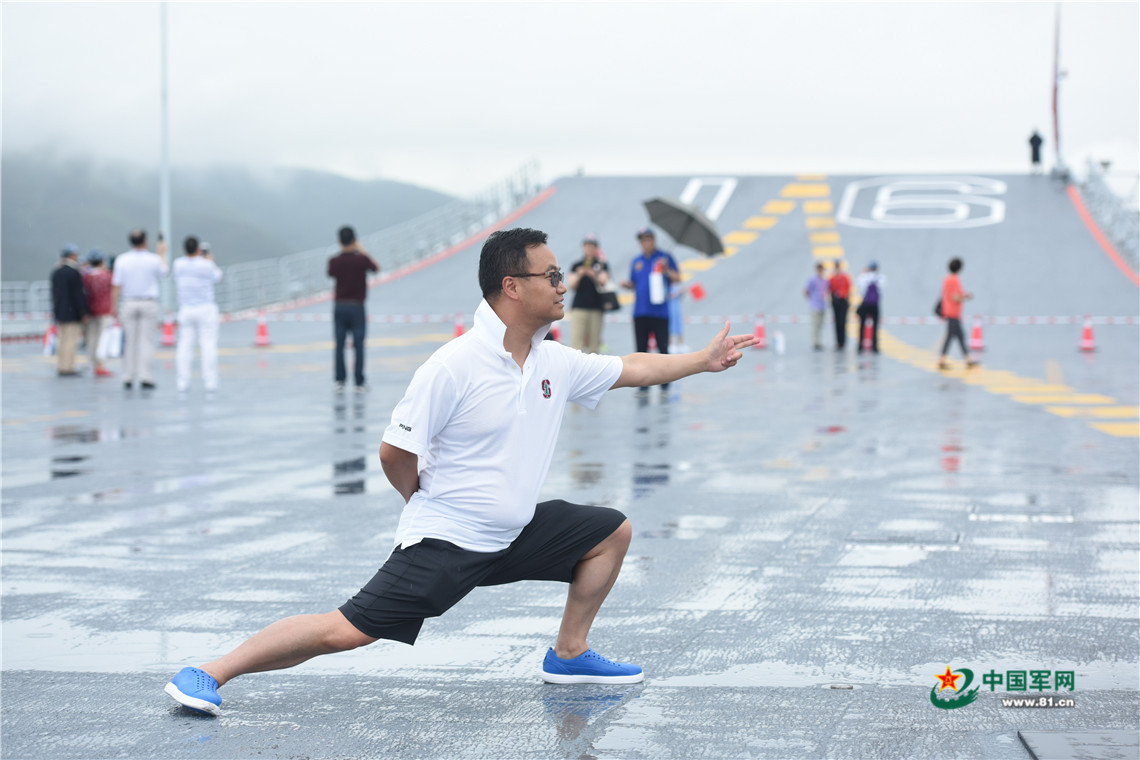 2017年7月8日,一名香港市民在辽宁舰的飞行甲板上模仿“航母STYLE”动作。