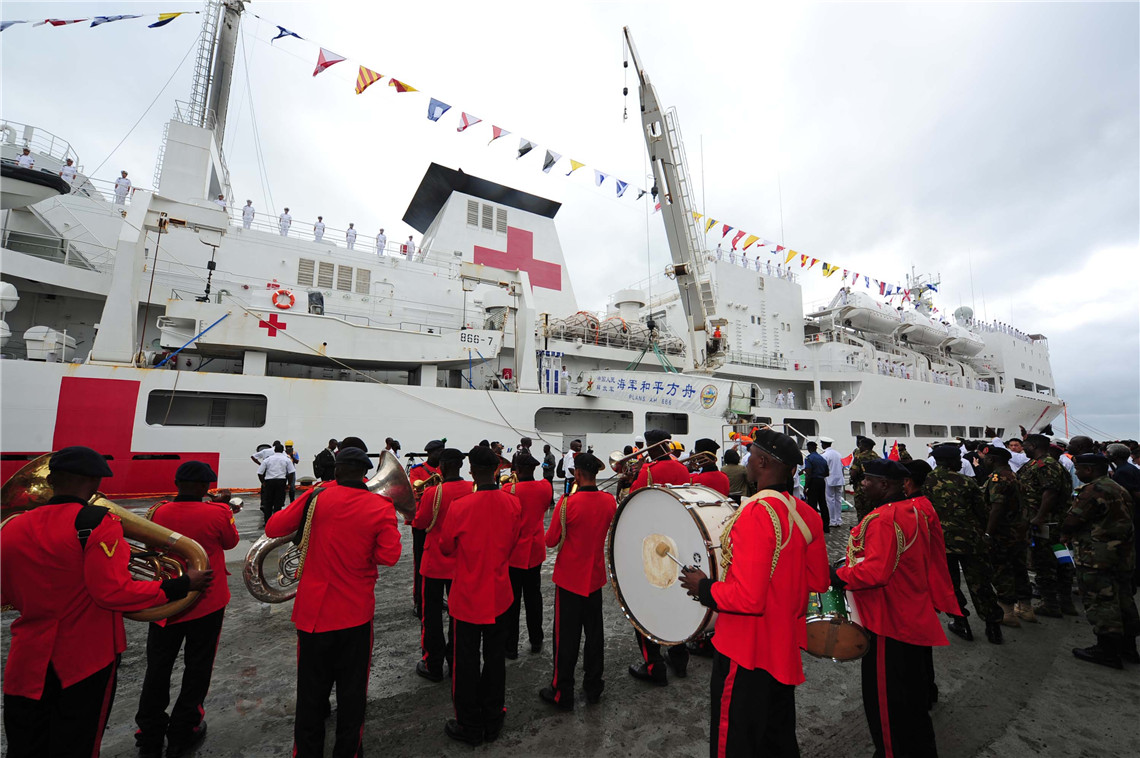 2017年9月19日,在塞拉利昂弗里敦港,塞拉利昂军乐团奏乐,欢迎中国海军和平方舟医院船。江山 摄影