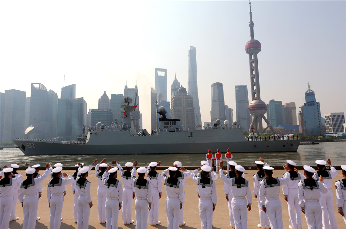2017年4月23日,欢送仪式上,部队官兵在上海黄浦江畔为远航访问编队送行。新华社记者 陈飞 摄影