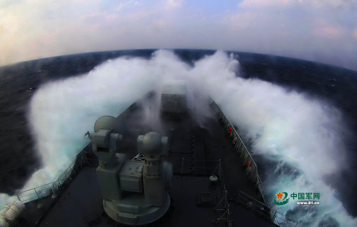 2017年3月2日,在西太平洋某海域,中国海军远海训练舰艇编队参加舰机实兵对抗演练。当日,中国海军航空兵轰炸机、歼击机、警戒机等多型多架飞机,经宫古海峡赴西太平洋某海域,与航经这一海域的海军远海训练舰艇编队进行了实兵对抗演练。陈小勇 摄影