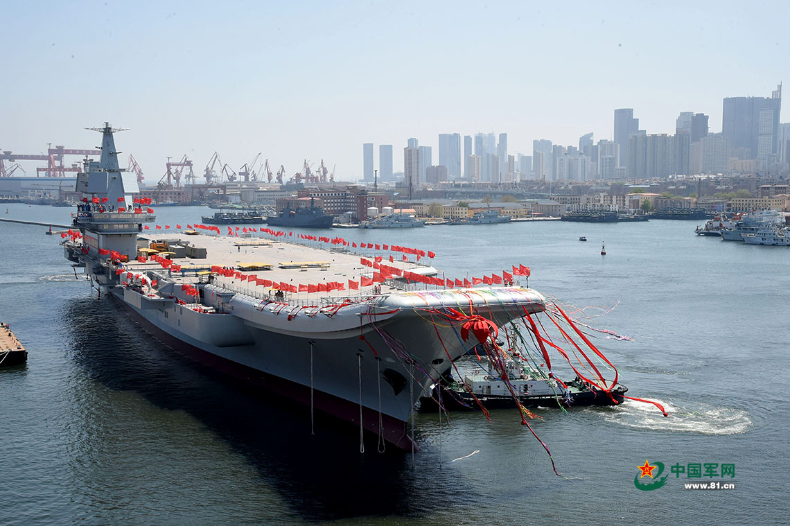 2017年4月26日,我国第二艘航空母舰下水仪式在中国船舶重工集团公司大连造船厂举行。图为航空母舰在拖曳牵引下缓缓移出船坞,停靠码头。冯凯旋 摄影