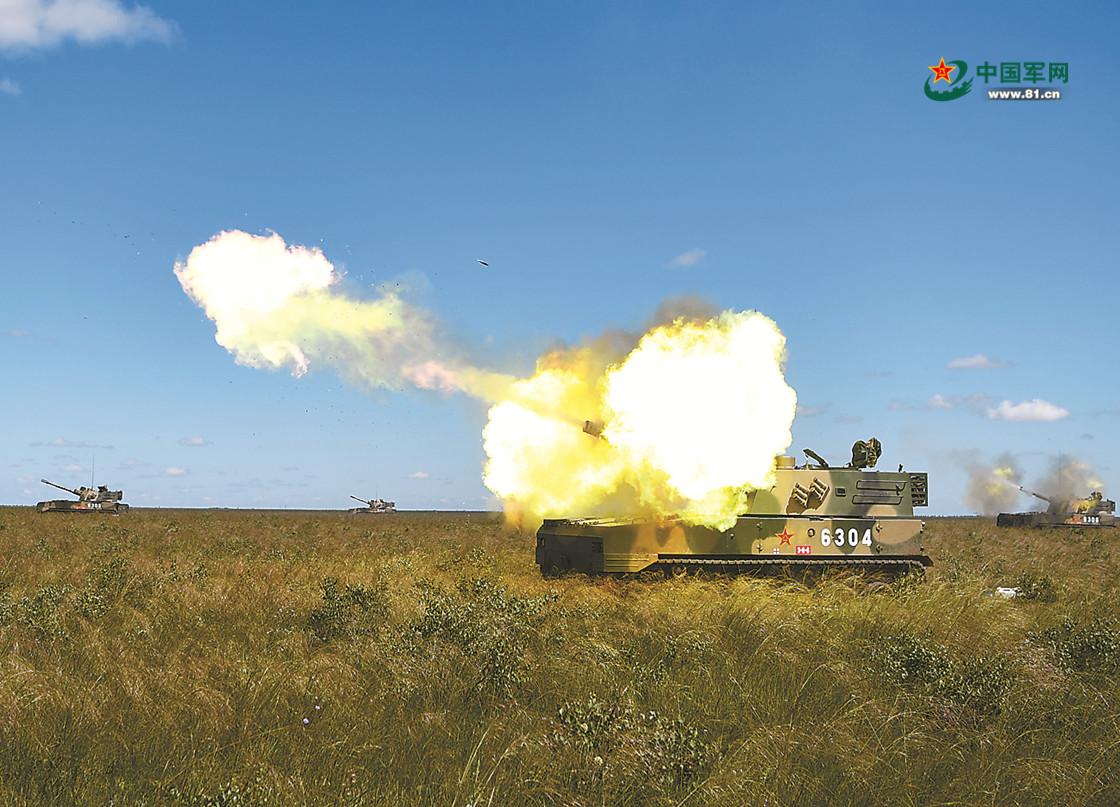 中方参演部队在实兵演习中进行火力打击。