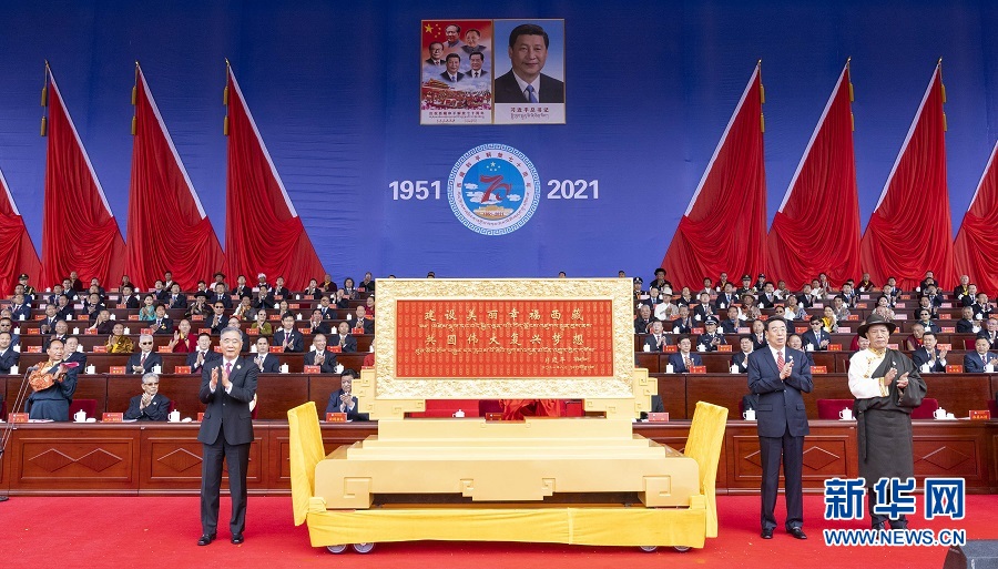 8月19日,庆祝西藏和平解放70周年大会在拉萨隆重举行。中共中央政治局常委、全国政协主席、中央代表团团长汪洋向西藏自治区、西藏军区、武警西藏总队、西藏自治区政法系统、中国佛协西藏分会分别赠送了中共中央总书记、国家主席、中央军委主席习近平题词的“建设美丽幸福西藏 共圆伟大复兴梦想”贺匾和贺幛。新华社记者 黄敬文 摄