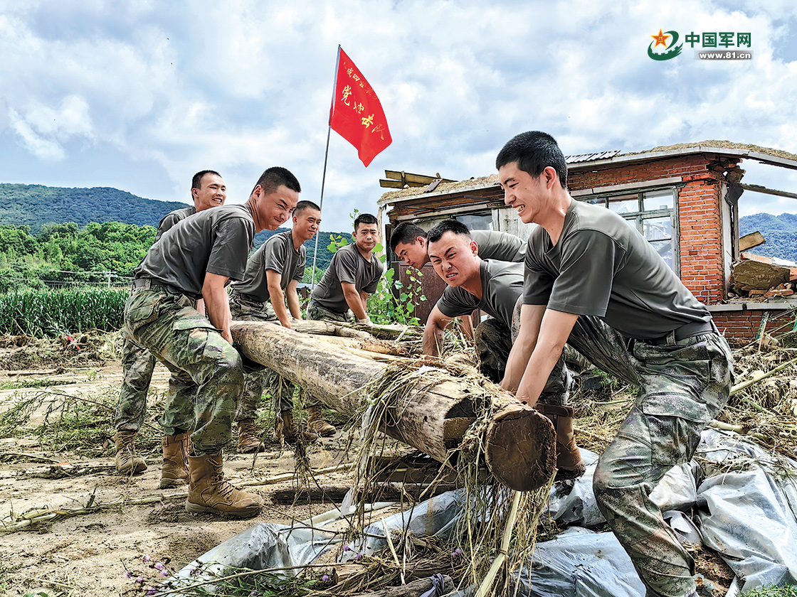 8月8日,第78集团军某旅党员突击队在吉林省舒兰市开原镇清理杂物。毛冰峰摄